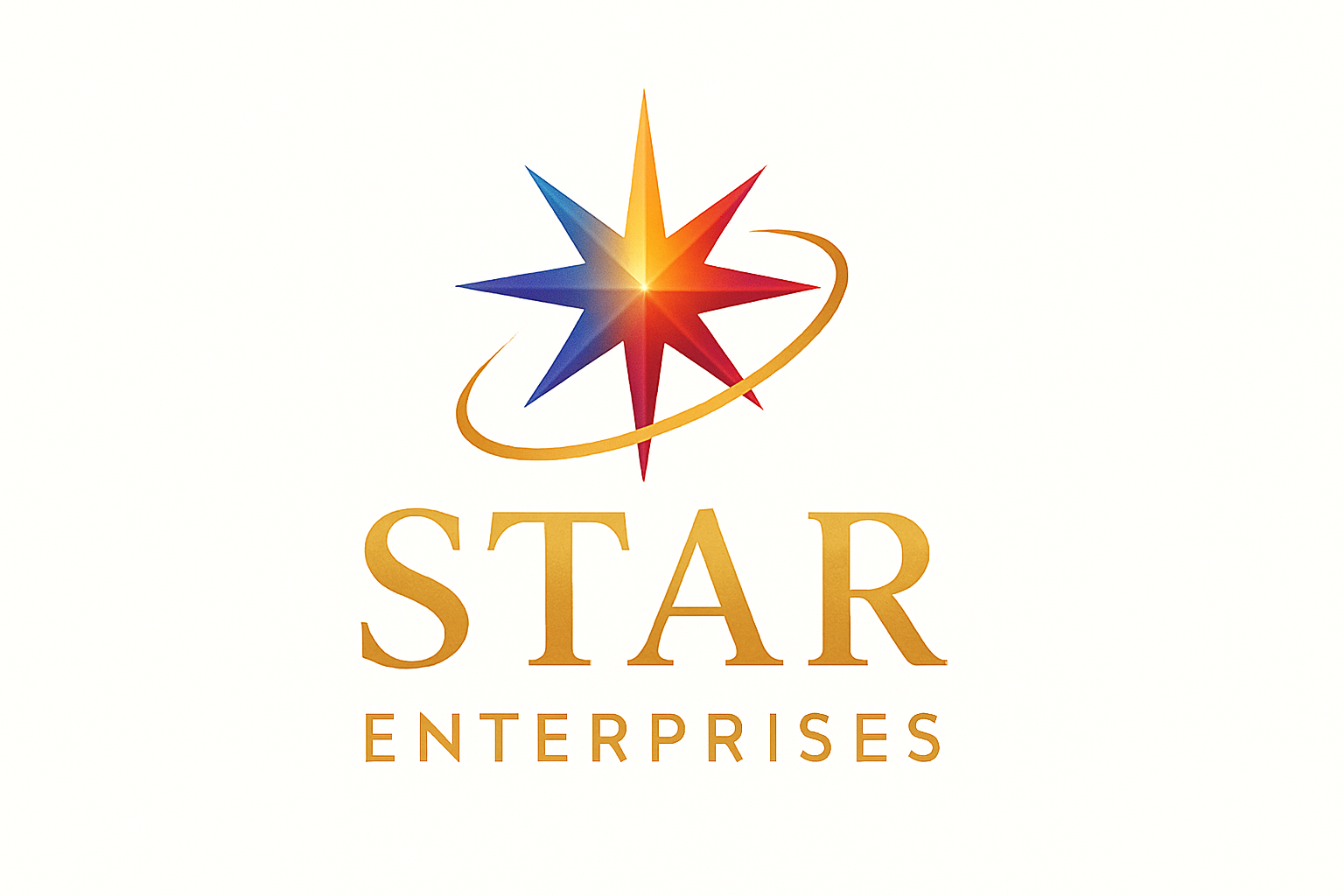Logo of Star Enterprises featuring a multicolored star with an orbit around it and the company name written below in gold lettering.